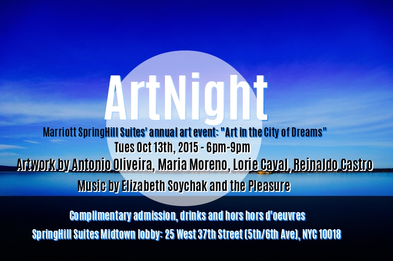 This Tuesday, October 13th (6pm-9pm) some of my paintings will be included in a group exhibition: ArtNight. It’s an annual event hosted by the Marriott SpringHill Suites; this year’s event is titled “Art in the City of Dreams.” There will be artwork by Maria Moreno, Antonio Oliveiria, Reinaldo Castro and me – along with live music by Elizabeth Soychack & the Pleasure. The hotel will be serving complimentary drinks and hors d’oeuvres and no cover to get in. So if you’re available, please come along – and feel free to bring friends!