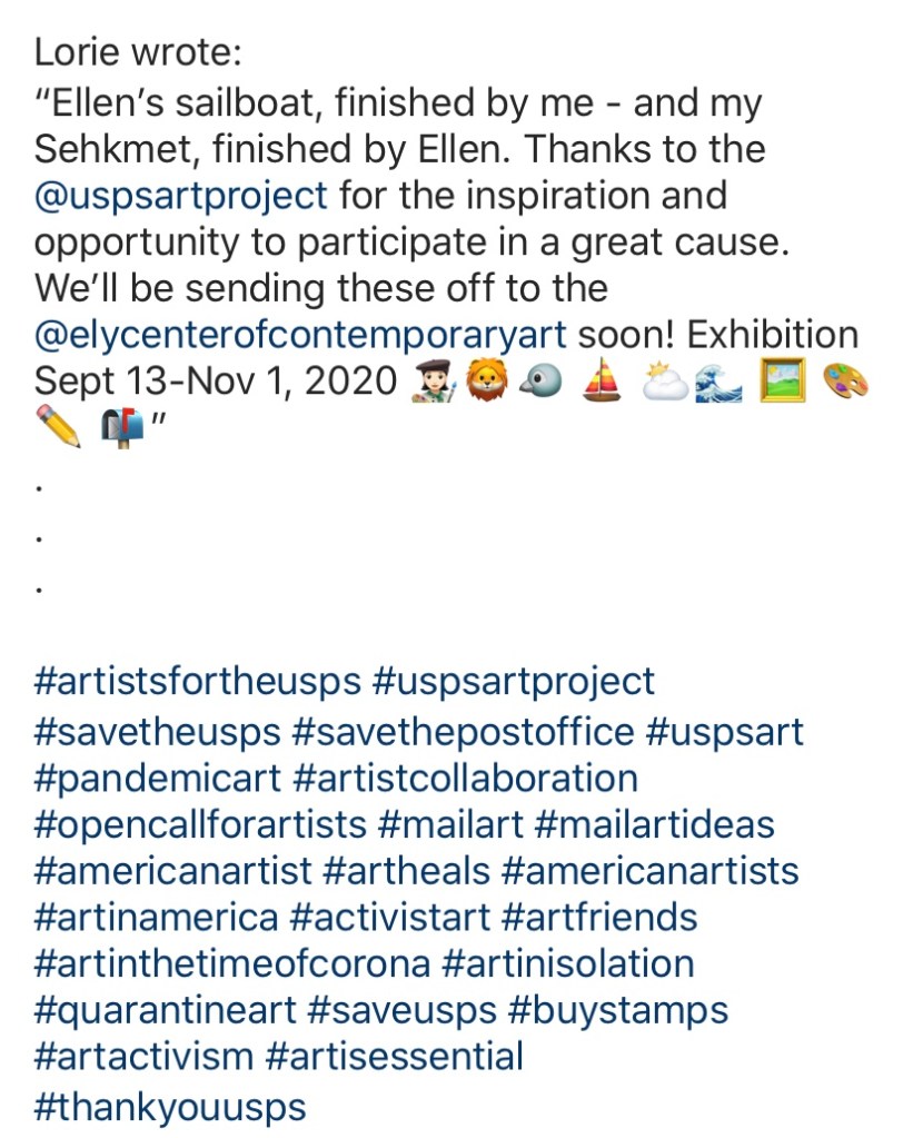 ArtNet News reported on the significance of the USPS Art Project and how it has grown: “A Quarantine Mail-Art Initiative Challenged Artists to Collaborate Through the USPS. Hundreds Answered the Call.”