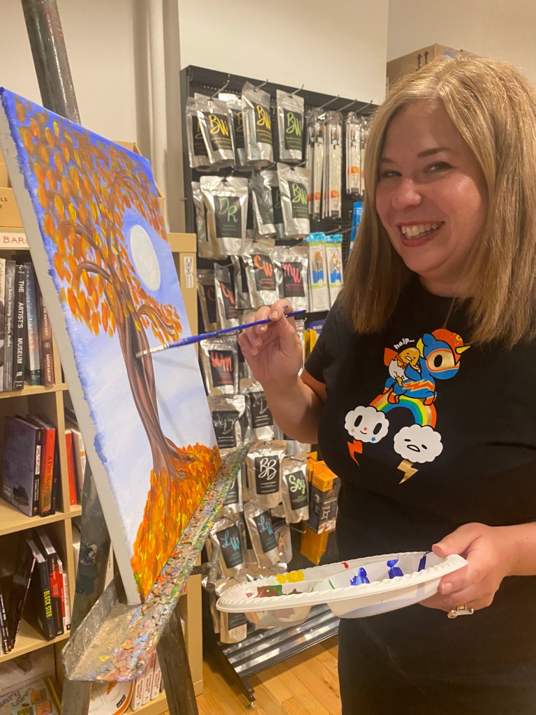 Since September of this year, I have been hosting “paint and sip” events at a newly-opened local art shop, Sunnyside Arts. It started out on a whim; I thought it might be fun to try. I had never been an art teacher of any sort, but I have been a party host and producer – plus I am a painter – so I figured I could make it work. And I am so happy that I took a chance and tried because the paint and sip events have been a great success.