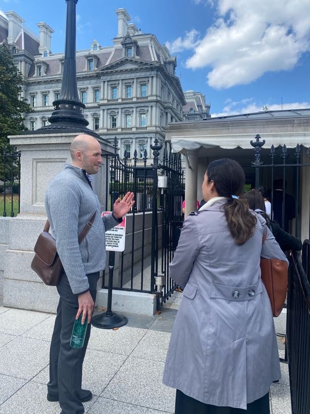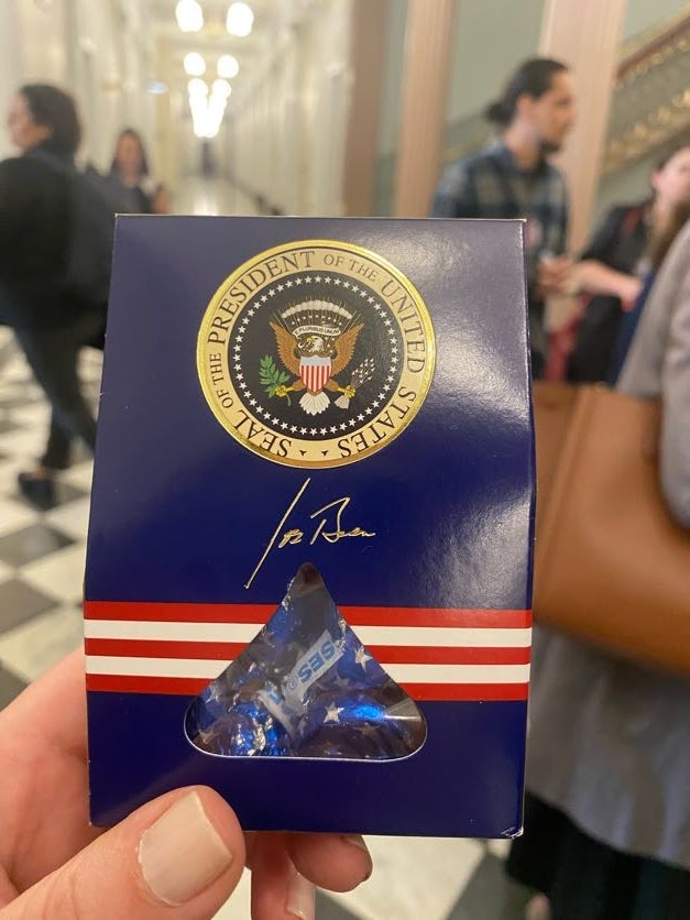 But wait, there’s more! After we were done at the Archives, we all jumped in Ubers and shot over to the White House. Even though we had all registered in advance for clearance, we still had to go through a security checkpoint which took quite a while. Eventually, we got in to the Eisenhower Building for our meeting with Sol Ortega who is President Biden’s Senior Advisor for Public Engagement. We had the opportunity to sit around a table and discuss our work and advocate for the support of Latinx arts and culture on a national level. Suddenly, we had to pop out of our seats because the conference room was in demand. But that didn’t stop us from carrying the conversation into the hallway. Ms. Ortega was gracious and engaged. In the end she gave us each a box of Presidential Hershey’s Kisses as a parting gift (there was a kiss theme going on that day!), and urged us to stay in touch and keep the conversation going.